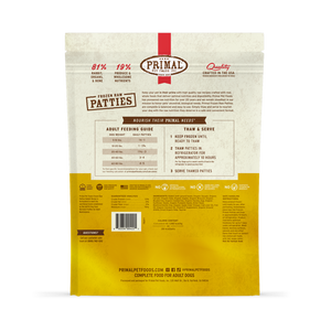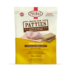 Primal’s complete and balanced Frozen Raw Patties come in larger portions ideal for large-breed dogs and multi-dog families. Our Rabbit Recipe features farm-raised, antibiotic-free rabbit raised without steroids or added hormones. It also includes naturally derived vitamins and minerals for optimal nutrition and digestibility. What you won’t find in our dog food recipes is synthetic vitamins and minerals, ever. Just thaw and serve. Available in 6-pound resealable bags.