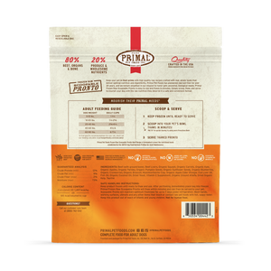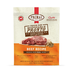 This nourishing, biologically appropriate raw dog food thaws in minutes and comes in a convenient, bite-sized, easy-to-portion format. Primal’s Beef Recipe Frozen Raw Scoopable Pronto features grass-fed beef raised without steroids or added hormones and other real, whole foods that deliver optimal nutrition and digestibility. Just scoop and serve to keep your pup in their prime. Available in 3/4-pound and 4-pound resealable bags.