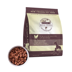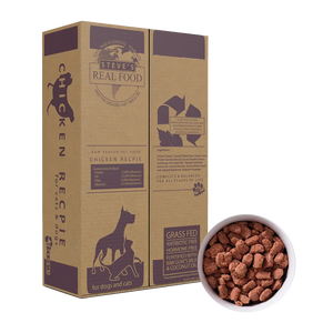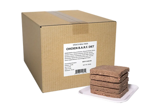 Steve’s Real Food frozen raw chicken Recipe is made with free-range, vegetarian-fed chicken. It is complete and balanced for all stages of life and can be fed to both dogs and cats. The chicken recipe is a BARF formulation composed of 80% meat/organ/bone, 15% produce, and 5% value-added ingredients such as green-lipped mussel, coconut oil, and raw goat milk to provide your pet everything they need WITHOUT the use of synthetic vitamin packs.