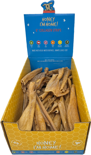Our Collagen Strips deliver a protein-rich chewing experience and are naturally rich in chondroitin and glucosamine, which support healthy joints and coat. Collagen is found below the top layer of skin which has higher protein and less fat than traditional rawhide treats and digests much easier.