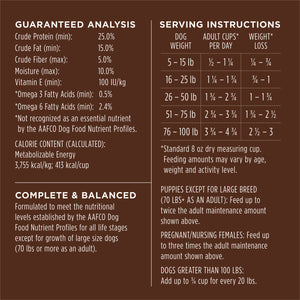 Crude Protein (min): 25.0%, Crude Fat (min): 15.0%, Crude Fiber (max): 5.0%, Moisture (max): 10.0%, Vitamin E (min): 100 IU/kg, *Omega 3 Fatty Acids (min): 0.5%, *Omega 6 Fatty Acids (min): 2.4%, *Not recognized as an essential nutrient by the AAFCO Dog Food Nutrient Profiles