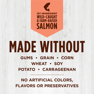 Salmon, Salmon Broth, Pork Liver, Montmorillonite Clay, Ground Flaxseed, Egg Product, Peas, Carrots, Potassium Chloride, Minerals (Iron Proteinate, Zinc Proteinate, Copper Proteinate, Manganese Proteinate, Sodium Selenite, Potassium Iodide), Choline Chloride, Salt, Sunflower Oil, Menhaden Fish Oil (preserved with Mixed Tocopherols), Vitamins (Thiamine Mononitrate, Vitamin E Supplement, Niacin Supplement, d-Calcium Pantothenate, Pyridoxine Hydrochloride, Riboflavin Supplement, Vitamin A Supplement, Biotin, Vitamin D3 Supplement, Vitamin B12 Supplement, Folic Acid), Taurine, Magnesium Sulfate, L-Ascorbyl-2-Polyphosphate, Artichokes, Cranberries, Pumpkin, Tomato, Blueberries, Broccoli, Cabbage, Kale, Parsley.