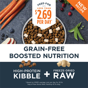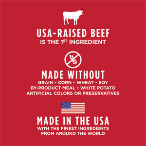 Beef, Chicken Meal, Peas, Turkey Meal, Chicken Fat (preserved with Mixed Tocopherols), Tapioca, Sweet Potatoes, Dried Yeast, Ground Flaxseed, Chickpeas, Fish Meal, Natural Flavor, Freeze-Dried Beef, Dried Tomato Pomace, Freeze-Dried Beef Liver, Freeze-Dried Beef Spleen, Pumpkin Seeds, Freeze-Dried Beef Kidney, Montmorillonite Clay, Vitamins (Vitamin E Supplement, Vitamin A Supplement, Niacin Supplement, Thiamine Mononitrate, d-Calcium Pantothenate, Riboflavin Supplement, Pyridoxine Hydrochloride, Vitamin B12 Supplement, Folic Acid, Vitamin D3 Supplement, Biotin), Apples, Blueberries, Carrots, Cranberries, Salt, Miscanthus Grass, Minerals (Zinc Proteinate, Iron Proteinate, Copper Proteinate, Manganese Proteinate, Sodium Selenite, Ethylenediamine Dihydriodide), Potassium Chloride, Choline Chloride, Taurine, Yeast Culture, Dried Lactobacillus acidophilus Fermentation Product, Dried Enterococcus faecium Fermentation Product, Dried Aspergillus oryzae Fermentation Extract, Dried Trichoderma longibrachiatum Fermentation Extract, Dried Bacillus subtilis Fermentation Extract, Salmon Oil, Rosemary Extract.