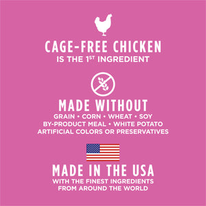 Chicken, Chicken Meal, Peas, Chicken Fat (preserved with Mixed Tocopherols), Tapioca, Sweet Potatoes, Fish Meal, Turkey Meal, Freeze-Dried Chicken, Chickpeas, Dried Tomato Pomace, Natural Flavor, Ground Flaxseed, Salt, Coconut Oil, Freeze-Dried Chicken Liver, Potassium Chloride, Pumpkin Seeds, Montmorillonite Clay, Freeze-Dried Chicken Heart, Vitamins (Vitamin E Supplement, Niacin Supplement, Thiamine Mononitrate, d-Calcium Pantothenate, Vitamin A Supplement, Riboflavin Supplement, Pyridoxine Hydrochloride, Vitamin B12 Supplement, Folic Acid, Vitamin D3 Supplement, Biotin), Apples, Blueberries, Carrots, Cranberries, Miscanthus Grass, Dried Yeast, Minerals (Zinc Proteinate, Iron Proteinate, Copper Proteinate, Manganese Proteinate, Sodium Selenite, Ethylenediamine Dihydriodide), Choline Chloride, Yeast Culture, Dried Lactobacillus acidophilus Fermentation Product, Dried Enterococcus faecium Fermentation Product, Dried Aspergillus oryzae Fermentation Extract, Dried Trichoderma longibrachiatum Fermentation Extract, Dried Bacillus subtilis Fermentation Extract, Salmon Oil, Rosemary Extract.