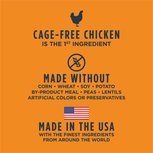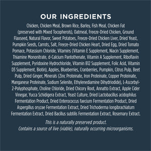 Chicken, Chicken Meal, Brown Rice, Barley, Fish Meal, Chicken Fat (preserved with Mixed Tocopherols), Oatmeal, Freeze-Dried Chicken, Ground Flaxseed, Natural Flavor, Sweet Potatoes, Freeze-Dried Chicken Liver, Dried Yeast, Pumpkin Seeds, Carrots, Salt, Freeze-Dried Chicken Heart, Dried Egg, Dried Tomato Pomace, Potassium Chloride, Vitamins (Vitamin E Supplement, Niacin Supplement, Thiamine Mononitrate, d-Calcium Pantothenate, Vitamin A Supplement, Riboflavin Supplement, Pyridoxine Hydrochloride, Vitamin B12 Supplement, Folic Acid, Vitamin D3 Supplement, Biotin), Apples, Blueberries, Cranberries, Pumpkin, Citrus Pulp, Beet Pulp, Dried Ginger, Minerals (Zinc Proteinate, Iron Proteinate, Copper Proteinate, Manganese Proteinate, Sodium Selenite, Ethylenediamine Dihydriodide), L-Ascorbyl-2-Polyphosphate, Choline Chloride, Dried Chicory Root, Annatto Extract, Apple Cider Vinegar, Yucca Schidigera Extract, Yeast Culture, Dried Lactobacillus acidophilus Fermentation Product, Dried Enterococcus faecium Fermentation Product, Dried Aspergillus oryzae Fermentation Extract, Dried Trichoderma longibrachiatum Fermentation Extract, Dried Bacillus subtilis Fermentation Extract, Rosemary Extract.