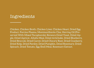 Chicken, Chicken Broth, Chicken Liver, Chicken Heart, Dried Egg Product, Porcine Plasma, Montmorillonite Clay, Herring Oil (Preserved With Mixed Tocopherols), Brewers Dried Yeast, Dried Apple, Dried Apricot, Alfalfa Meal, Dried Artichoke, Dried Blueberry, Dried Broccoli, Dried Carrot, Dried Chicory Root, Dried Cranberry, Dried Kelp, Dried Parsley, Dried Pumpkin, Dried Rosemary, Dried Spinach, Dried Tomato, Egg Shell Meal, Rosemary Extract.