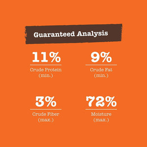 Amount of food to feed depends upon the dog’s weight, activity level, age, environment, and breed. Feed at room temperature and refrigerate unused portion. Always provide access to clean, fresh water. Adult: Feed ¾ to 1 can per 15 lbs. of body weight per day. Puppy: Feed up to twice the adult amount to puppies. Gestation & Lactation: Feed up to three times the normal adult amount.