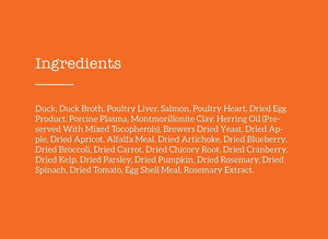 Duck, Duck Broth, Poultry Liver, Salmon, Poultry Heart, Dried Egg Product, Porcine Plasma, Montmorillonite Clay, Herring Oil (Preserved With Mixed Tocopherols), Brewers Dried Yeast, Dried Apple, Dried Apricot, Alfalfa Meal, Dried Artichoke, Dried Blueberry, Dried Broccoli, Dried Carrot, Dried Chicory Root, Dried Cranberry, Dried Kelp, Dried Parsley, Dried Pumpkin, Dried Rosemary, Dried Spinach, Dried Tomato, Egg Shell Meal, Rosemary Extract.