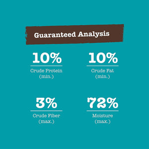 Amount of food to feed depends upon the dog’s weight, activity level, age, environment, and breed. Feed at room temperature and refrigerate unused portion. Always provide access to clean, fresh water. Adult: Feed ¾ to 1 can per 15 lbs. of body weight per day. Puppy: Feed up to twice the adult amount to puppies. Gestation & Lactation: Feed up to three times the normal adult amount.