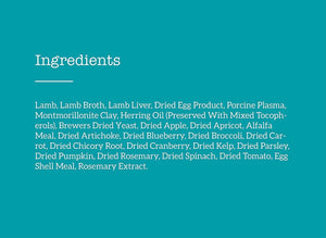 Lamb, Lamb Broth, Pork Liver, Montmorillonite Clay, Porcine Plasma, Salmon Oil (Preserved with Mixed Tocopherols), Lamb Meal, Alfalfa Nutrient Concentrate, Dried Apple, Dried Apricot, Dried Artichoke, Dried Blueberry, Dried Broccoli, Dried Carrot, Dried Chicory Root, Dried Cranberry, Dried Kelp, Dried Parsley, Dried Pumpkin, Dried Rosemary, Dried Spinach, Dried Tomato, Egg Shell Meal.