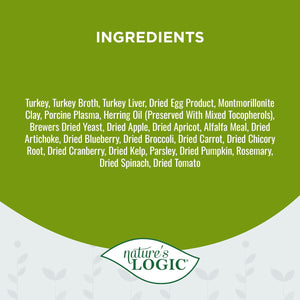 Turkey, Turkey Broth, Turkey Liver, Dried Egg Product, Montmorillonite Clay, Porcine Plasma, Herring Oil (Preserved With Mixed Tocopherols), Brewers Dried Yeast, Dried Apple, Dried Apricot, Alfalfa Meal, Dried Artichoke, Dried Blueberry, Dried Broccoli, Dried Carrot, Dried Chicory Root, Dried Cranberry, Dried Kelp, Parsley, Dried Pumpkin, Rosemary, Dried Spinach, Dried Tomato