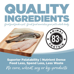 Haddock, trout, duck, salmon, salmon meal, pollock meal, millet, sunflower oil, buckwheat middlings, spelt, dried egg product, dried plain beet pulp, quinoa, whitefish meal, natural flavor, pork gelatin, catfish meal, potassium chloride, flax seed, yeast extract, salt, choline chloride, calcium carbonate, minerals (zinc proteinate, iron proteinate, selenium yeast, copper proteinate, manganese proteinate, calcium iodate), hydrolyzed yeast, dried pumpkin, dried blueberries, dried carrots, dried apricots, dried apples, DL methionine, brewers dried yeast, dried squash, taurine, vitamins (vitamin E supplement, niacin supplement, vitamin A supplement, thiamine mononitrate, d-calcium pantothenate, pyridoxine hydrochloride, riboflavin supplement, biotin, vitamin B12 supplement, folic acid, vitamin D3 supplement), tocopherols and citric acid (preservatives), lactic acid, yucca schidigera extract, yeast culture, dried Aspergillus oryzae fermentation extract, dried Bacillus subtilis fermentation product, dried Bacillus licheniformis fermentation product, dried Trichoderma longibrachiatum fermentation extract, dried Enterococcus faecium fermentation product, dried Lactobacillus acidophilus fermentation product, dried Bacillus subtilis fermentation extract, L-carnitine, rosemary extract