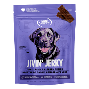 NutriSource Quail, Duck & Chicken Jivin’ Jerky is made with high-quality protein.