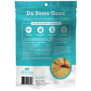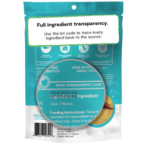 This crunchy, single ingredient treat is made with sustainably sourced, wild-caught cod that’s lightly cooked and dehydrated at a low temperature to create a healthy and tasty treat. As with all Open Farm products, our ethically sourced, farm to bowl ingredients are 100% traceable. Approximately 11-12 treats per bag.
