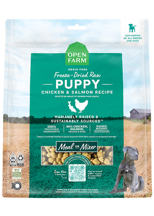 This Freeze-Dried Raw puppy focused recipe features G.A.P certified, humanely raised chicken and chicken organs raised without antibiotics or added hormones. In addition, Ocean Wise recommended salmon and organic, non-GMO fruits and vegetables are added to provide a highly nutritious topper or complete and balanced meal your pup will crave.