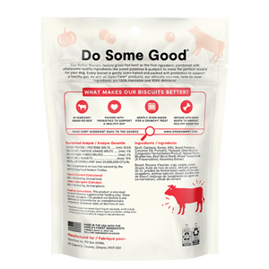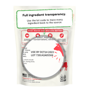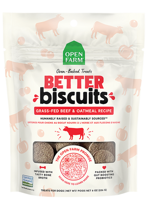 What makes our biscuits better? Our grass-fed beef & oatmeal recipe treats are made with humanely raised beef as the first ingredient and are combined with superfoods like pumpkin & sweet potato to deliver a crave-worthy taste. These treats are gently oven-baked for a crunchy treat, packed with probiotics to support a healthy gut, and infused with bone broth to support healthy digestion, making them a perfect reward for your pup!