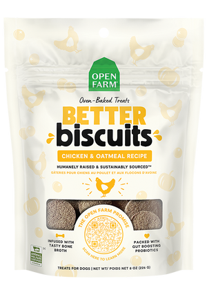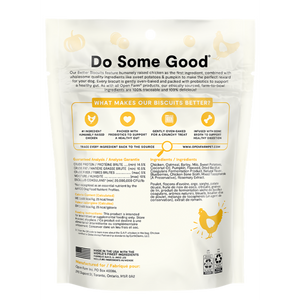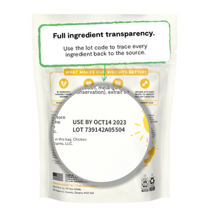 What makes our biscuits better? Our chicken & oatmeal recipe treats are made with humanely raised chicken as the first ingredient and are combined with superfoods like pumpkin & sweet potato to deliver a crave-worthy taste. These treats are gently oven-baked for a crunchy treat, packed with probiotics to support a healthy gut, and infused with bone broth to support healthy digestion, making them a perfect reward for your pup!
