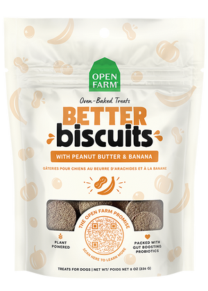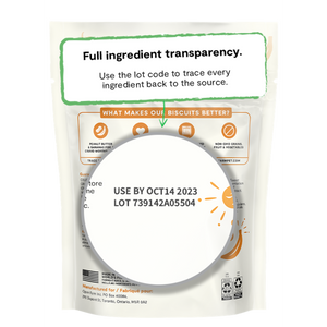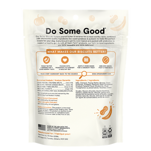What makes our biscuits better? These biscuits are made with peanut butter & banana and are combined with superfoods like pumpkin & sweet potato to deliver a crave-worthy taste. These treats are gently oven-baked for a crunchy treat, packed with probiotics to support a healthy gut, and made with non-GMO grains, fruit, & vegetables, making them a perfect reward for your pup!