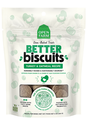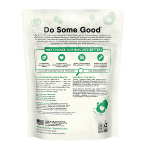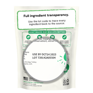 What makes our biscuits better? Our turkey & oatmeal recipe treats are made with humanely raised turkey as the first ingredient and are combined with superfoods like pumpkin & sweet potato to deliver a crave-worthy taste. These treats are gently oven-baked for a crunchy treat, packed with probiotics to support a healthy gut, and infused with bone broth to support healthy digestion, making them a perfect reward for your pup!