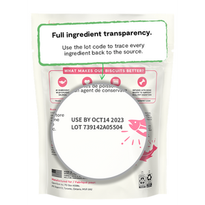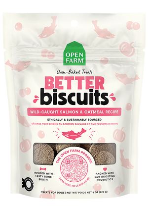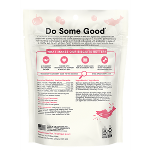 What makes our biscuits better? Our wild-caught salmon & oatmeal recipe treats are made with Ocean Wise recommended salmon as the first ingredient and are combined with superfoods like pumpkin & sweet potato to deliver a crave-worthy taste. These treats are gently oven-baked for a crunchy treat, packed with probiotics to support a healthy gut, and infused with bone broth to support healthy digestion, making them a perfect reward for your pup!