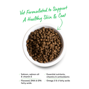 This vet-formulated kibble provides high omega fatty acids to support healthy skin and a shiny coat. This complete and balanced meal is made with high quality Ocean Wise recommended wild-caught salmon as the #1 ingredient, combined with salmon oil and vitamin E to help nourish the skin and support a shiny, glossy coat. Rich in flaxseed, biotin, & zinc to support healthy skin and hair growth.