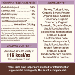 Turkey, Turkey Liver, Organic Sweet Potato, Organic Kale, Organic Rosemary, Organic Cranberry, Organic Turmeric, Organic Ginger, Liquid Lactobacillus acidophilus fermentation product, Liquid Lactobacillus casei fermentation product, Liquid Lactobacillus reuteri fermentation product, Liquid Bifidobacterium animalis fermentation product