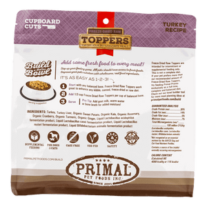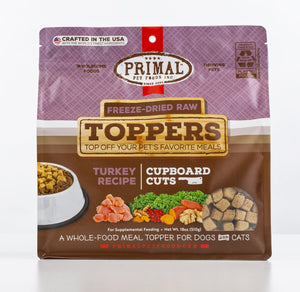Add a boost of biologically appropriate raw nutrition to your pet’s diet. Primal’s Turkey Recipe Cupboard Cuts Freeze-Dried Raw Topper for cat and dog food is made with cage-free turkey raised without antibiotics, steroids, or added hormones to nourish your pet with superior levels of selenium, iron, and vitamins B3 and B6. It also features certified organic produce for antioxidants and phytonutrients, plus probiotics for safety. It’s shelf-stable and available in 3.5- and 18-ounce resealable bags.