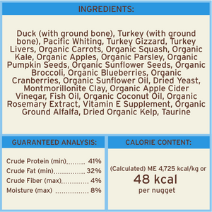 Duck (with ground bone), Turkey (with ground bone), Pacific Whiting, Turkey Gizzard, Turkey Livers, Organic Carrots, Organic Squash, Organic Kale, Organic Apples, Organic Parsley, Organic Pumpkin Seeds, Organic Sunflower Seeds, Organic Broccoli, Organic Blueberries, Organic Cranberries, Organic Sunflower Oil, Dried Yeast, Montmorillonite Clay, Organic Apple Cider Vinegar, Fish Oil, Organic Coconut Oil, Organic Rosemary Extract, Vitamin E Supplement, Organic Ground Alfalfa, Dried Organic Kelp, Taurine