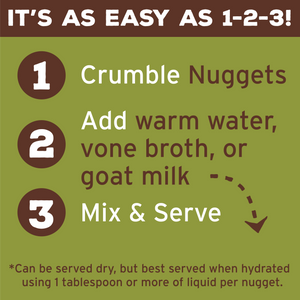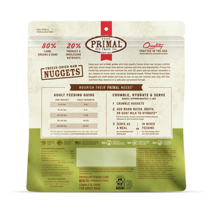 Primal Lamb Formula Nuggets Grain-Free Raw Freeze-Dried Dog Food offers your hungry pooch all the benefits of a safe and wholesome raw-food diet—without you having to grind, chop, measure or mix the ingredients yourself! Taking great pride to source only the best ingredients, this tasty and nutritious diet is packed with naturally derived vitamins and minerals. The high-protein ratio appeals to your canine companion’s primal diet, and it’s an excellent way to maintain a proper weight and boost overall health. And best of all, it’s a breeze to serve, thanks to the naturally preserved nuggets—just add water! The proof comes in watching her lick the bowl clean while thriving happily and healthfully.