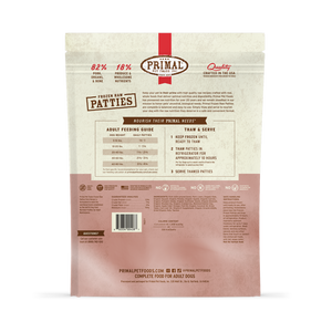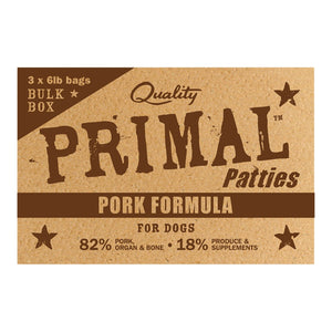 Primal’s complete and balanced Frozen Raw Patties come in larger portions ideal for large-breed dogs and multi-dog families. Our Pork Recipe features crate-free pork raised without antibiotics, steroids, or added hormones. It also includes naturally derived vitamins and minerals for optimal nutrition and digestibility. What you won’t find in our dog food recipes is synthetic vitamins and minerals, ever. Just thaw and serve. Available in 6-pound resealable bags and 18-pound bulk boxes.