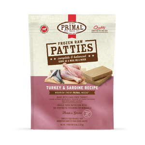 Primal’s complete and balanced Frozen Raw Patties come in larger portions ideal for large-breed dogs and multi-dog families. Our Turkey & Sardine Recipe is made with cage-free turkey raised without antibiotics, steroids, or added hormones and wild-caught sardines. It also includes naturally derived vitamins and minerals for optimal nutrition and digestibility. What you won’t find in our dog food recipes is synthetic vitamins and minerals, ever. Just thaw and serve. Available in 6-pound resealable bags and 18-pound boxes.