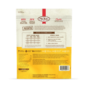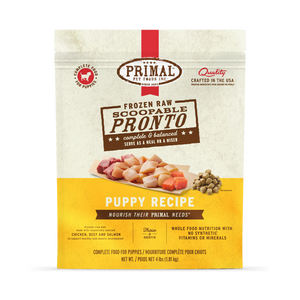 This nourishing, biologically appropriate raw dog food thaws in minutes and comes in a convenient, bite-sized, easy-to-portion format. Primal’s Puppy Recipe Frozen Raw Scoopable Pronto is specially formulated for puppies 2 to 12 months. It features a protein-rich diet made with responsibly sourced chicken, beef, and salmon to support healthy lean muscle development. Just scoop and serve to keep your puppy in their prime. Available in 4-pound resealable bags.