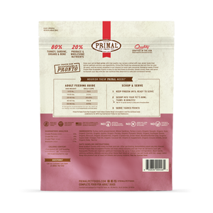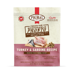 This nourishing, biologically appropriate raw dog food thaws in minutes and comes in a convenient, bite-sized, easy-to-portion format. Primal’s Turkey & Sardine Recipe Frozen Raw Scoopable Pronto is made with cage-free turkey raised without antibiotics, steroids, or added hormones, wild-caught sardines, and other real, whole foods that deliver optimal nutrition and digestibility. Just scoop and serve to keep your pup in their prime. Available in 4-pound resealable bags.