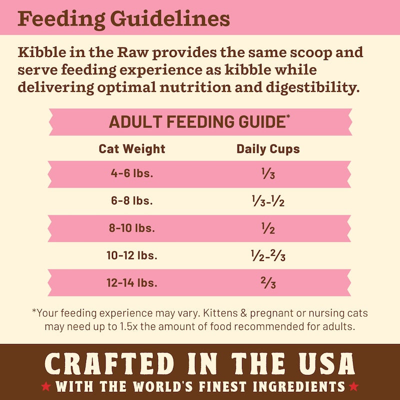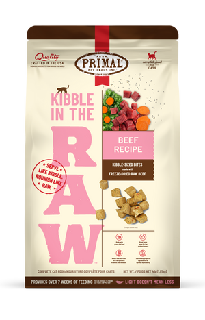 Kibble in the Raw reimagines “kibble” the Primal way so you can nourish your cat’s Primal needs. Our Beef Recipe is made with grass-fed beef and other thoughtfully selected, premium, and raw ingredients. Crafted entirely of freeze-dried bites, this recipe delivers optimized nutrition and digestibility in the same scoop-and-serve feeding experience as kibble - perfect for all feeding routines. It's lighter and more dense than traditional kibble so you get more feedings out of every pound of food.