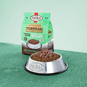 Primal’s Chicken Recipe Market Mix Raw Topper for cat and dog food is made with cage-free chicken raised without antibiotics, steroids, or added hormones to nourish your pet with superior levels of amino and essential fatty acids. It also features certified organic produce for antioxidants and phytonutrients, plus finely ground fresh chicken bones for a natural source of calcium. Store in the freezer and add to your pet’s favorite kibble, canned, or freeze-dried meal. Available in 5-pound resealable bags.