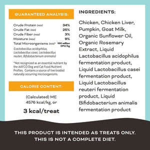 Chicken, Chicken Liver, Pumpkin, Goat Milk, Organic Sunflower Oil, Organic Rosemary Extract, Liquid Lactobacillus acidophilus fermentation product, Liquid Lactobacillus casei fermentation product, Liquid Lactobacillus reuteri fermentation product, Liquid Bifidobacterium animalis fermentation product