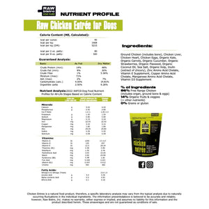 Ground Chicken (includes bone), Chicken Heart, Chicken Liver, Chicken Eggs, Organic Kale, Organic Carrots, Organic Cucumber, Organic Strawberries, Organic Flaxseed, Organic Apple Cider Vinegar, Organic Coconut Oil, Sea Salt, Organic Kelp, Inulin (extract of chicory), Zinc Amino Acid Chelate, Vitamin E Supplement, Copper Amino Acid Chelate, Manganese Amino Acid Chelate, Vitamin D3 Supplement