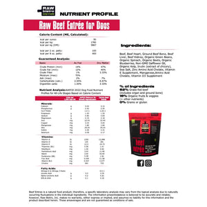 Beef, Beef Heart, Ground Beef Bone, Beef Liver, Beef Kidney, Organic Green Beans, Organic Spinach, Organic Beets, Organic Blueberries, Safflower Oil, Organic Kelp, Inulin (extract of chicory), Sea Salt, Zinc Amino Acid Chelate, Vitamin E Supplement, Manganese Amino Acid Chelate, Vitamin D3 Supplement