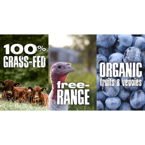 Our entree line of frozen raw dog food provides a complete & balanced, diversified diet from 100% grass-fed beef, free-range poultry, and other non-factory farmed animal protein sources. Single-source protein entrees are paired with different blends of organic veggies, fruits & other real ingredients from the farm. Rotate through our recipes for optimal nutrition & enjoyment