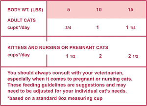 For nursing or pregnant cats and kittens, quantities per day can be doubled. Please note that you should always consult your veterinarian, especially when it comes to pregnant or nursing cats. These feeding guidelines are suggestions and may need to be adjusted depending on your individual cat’s needs.