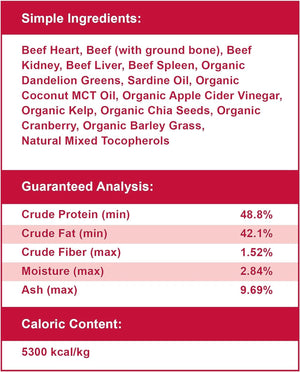 beef heart, beef (with ground bone) beef kidney, beef liver, organic dandelion greens, sardine oil, organic coconut oil, organic apple cider vinegar, organic kelp, organic chia seeds, organic cranberry, organic barley grass, mixed tocopherols
