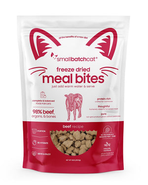 To rehydrate, simply mix ¼ cup of water for every ½ cup of meal bites.