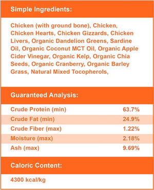 chicken (with ground bone), chicken, chicken hearts, chicken gizzards, chicken livers, organic dandelion greens, sardine oil, organic coconut oil, organic apple cider vinegar, organic kelp, organic chia seeds, organic cranberry, organic barley grass, mixed tocopherols