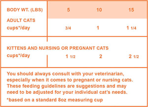 For nursing or pregnant cats and kittens, quantities per day can be doubled. Please note that you should always consult your veterinarian especially when it comes to mommas-to-be or nursing cats. These are only guidelines and may need to be adjusted depending on your individual cat’s needs.