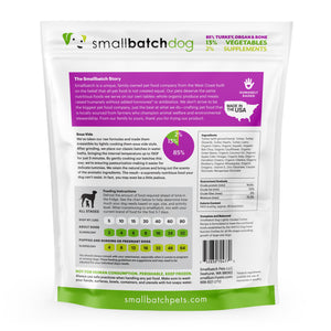 turkey (with ground bone), turkey, turkey gizzards, turkey hearts, turkey livers, organic celery, organic squash, organic bok choy, organic cauliflower, organic green beans, organic coconut oil, organic apple cider vinegar, organic kelp, organic dandelion greens, organic cilantro, organic blueberry, organic wheatgrass, organic oregano, vitamin e, zinc glycinate, copper glycinate, manganese glycinate