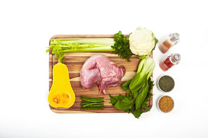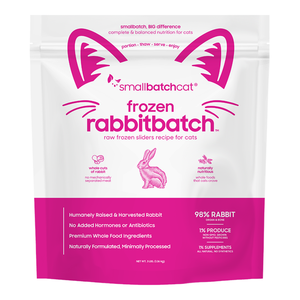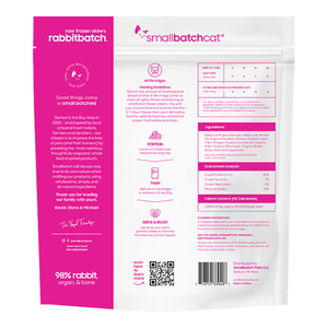 97% humanely raised and harvested rabbit, 1% organic produce, 2% natural supplements