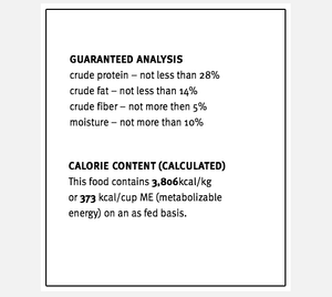 This food contains 3,806kcal/kg or 373 kcal/cup ME (metabolizable