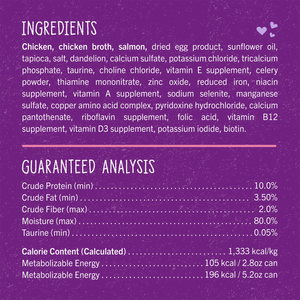 Chicken,biotin,calcium pantothenate,calcium sulfate,celery powder,chicken broth,choline chloride,copper amino acid complex,dandelion,dried egg product,folic acid,manganese sulfate,niacin supplement,potassium chloride,potassium iodide,pyridoxine hydrochloride,reduced iron,riboflavin supplement,salmon,salt,sodium selenite,sunflower oil,tapioca,taurine,thiamine mononitrate,tricalcium phosphate,vitamin A supplement,vitamin B12 supplement,vitamin D3 supplement,vitamin E supplement,zinc oxide