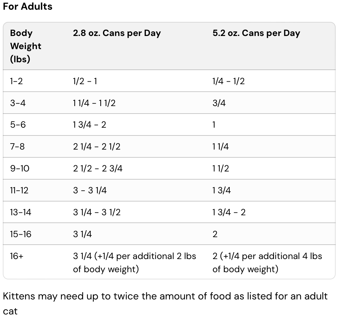 Salmon, Tuna & Mackerel: Crude Protein 10.0% (min), Crude Fat 3.5% (min), Crude Fiber 2.0% (max), Moisture 80.0% (max), Taurine 0.05% (min)