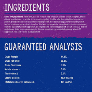 Rabbit with ground bone,biotin,choline chloride,copper proteinate,d-calcium pantothenate,dandelion greens,dried Bacillus coagulans fermentation product,dried Bifidobacterium longum fermentation product,dried Lactobacillus acidophilus fermentation product,dried Pediococcus acidilactici fermentation product,dried kelp,fenugreek seed,folic acid,iron proteinate,manganese proteinate,niacin supplement,olive oil,potassium chloride,pumpkin seed,pyridoxine hydrochloride,rabbit liver,riboflavin supplement,sodium phosphate,sodium selenite,taurine,thiamine mononitrate,tocopherols (preservative),vitamin A supplement,vitamin B12 supplement.,vitamin D3 supplement,vitamin E supplement,zinc proteinate
